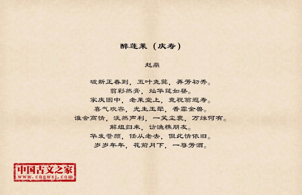 破新正春到,五叶尧蓂,弄芳初秀。翦彩然膏,灿华筵如昼。家庆图中,老莱堂上,竞祝翁遐寿。喜气欢容,光生玉斝,香霏金兽。谁会高情,淡然声利,一笑尘寰,万缘何有。解组归来,访渔樵朋友。华发苍颜,任从老去,但此情依旧。岁岁年年,花前月下,一尊芳酒。