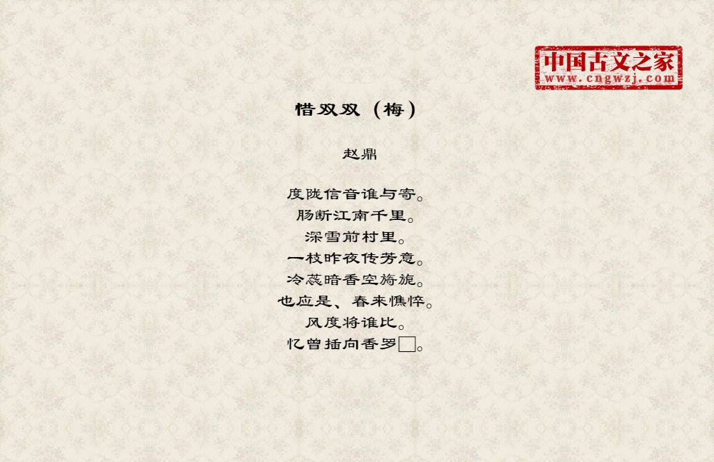 度陇信音谁与寄。肠断江南千里。深雪前村里。一枝昨夜传芳意。冷蕊暗香空旖旎。也应是、春来憔悴。风度将谁比。忆曾插向香罗□。