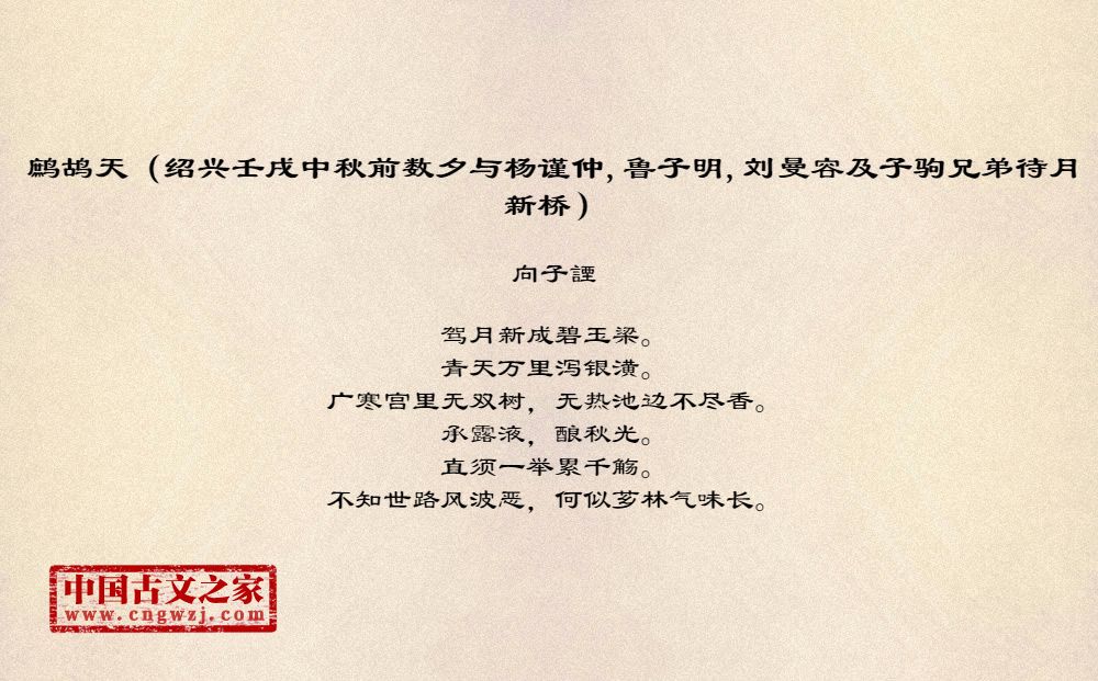 《鹧鸪天(绍兴壬戌中秋前数夕与杨谨仲,鲁子明,刘曼容及子驹兄弟待月新桥)》的原文打印版(向子諲)