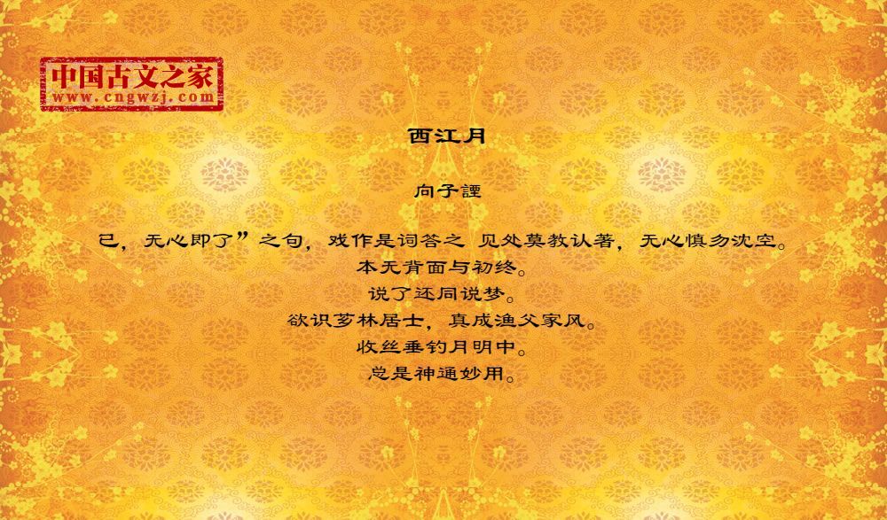 已,无心即了”之句,戏作是词答之 见处莫教认著,无心慎勿沈空。本无背面与初终。说了还同说梦。欲识芗林居士,真成渔父家风。收丝垂钓月明中。总是神通妙用。