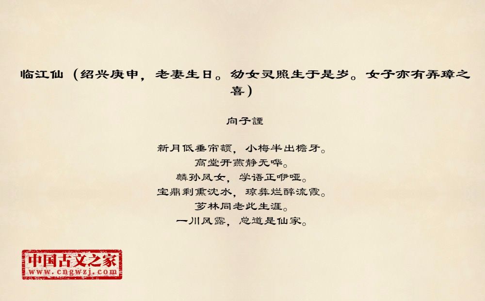 《临江仙(绍兴庚申,老妻生日。幼女灵照生于是岁。女子亦有弄璋之喜)》由向子諲创作