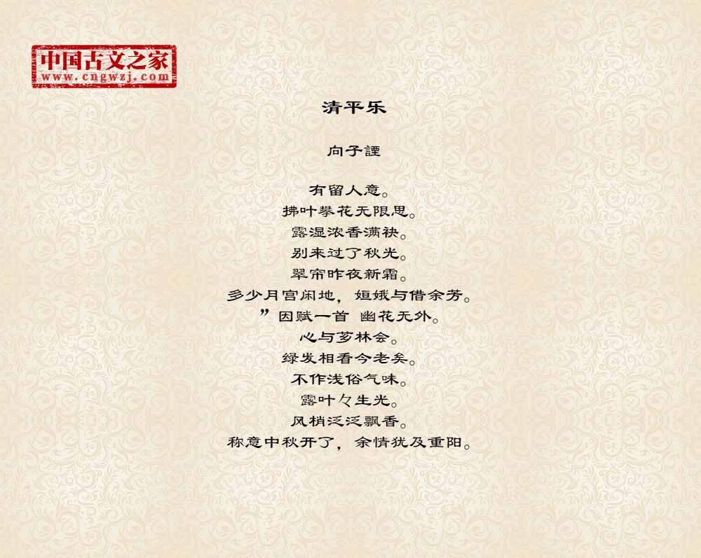 有留人意。拂叶攀花无限思。露湿浓香满袂。别来过了秋光。翠帘昨夜新霜。多少月宫闲地,姮娥与借余芳。”因赋一首 幽花无外。心与芗林会。绿发相看今老矣。不作浅俗气味。露叶々生光。风梢泛泛飘香。称意中秋开了,余情犹及重阳。