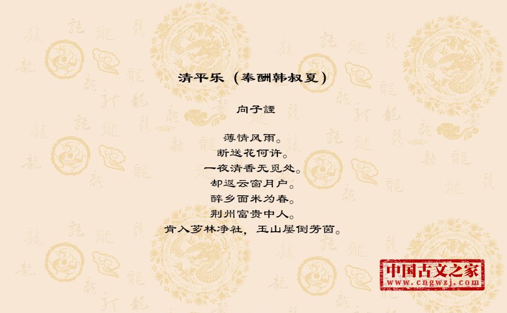薄情风雨。断送花何许。一夜清香无觅处。却返云窗月户。醉乡面米为春。荆州富贵中人。肯入芗林净社,玉山屡倒芳茵。