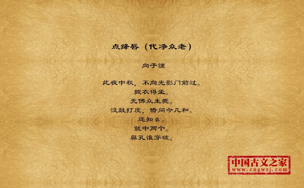 此夜中秋,不向光影门前过。披衣得坐。无佛众生我。没鼓打皮,借问今几和。还知么。就中两个。鼻孔谁穿破。