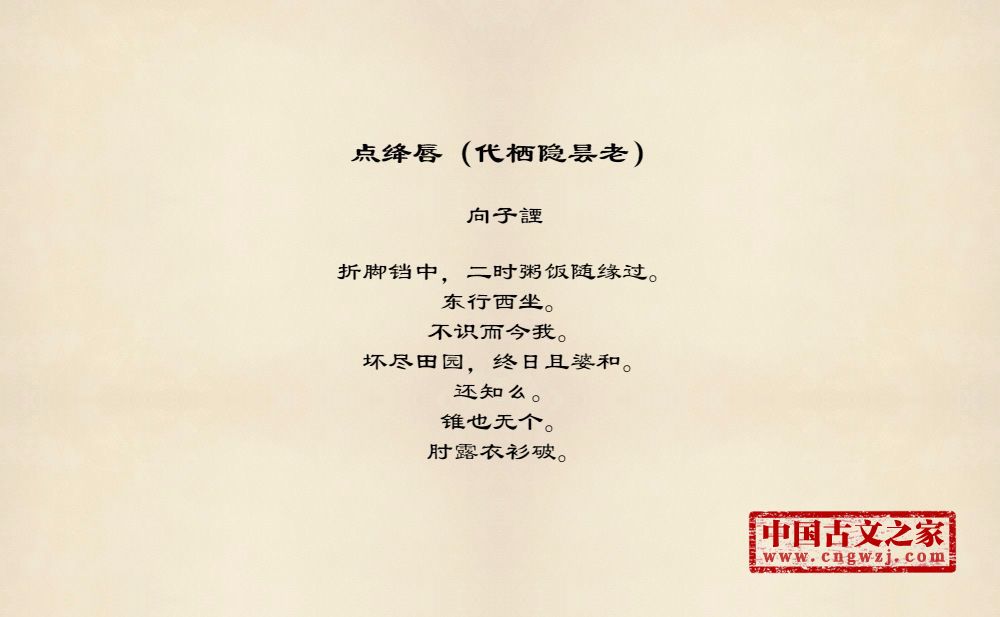 折脚铛中,二时粥饭随缘过。东行西坐。不识而今我。坏尽田园,终日且婆和。还知么。锥也无个。肘露衣衫破。