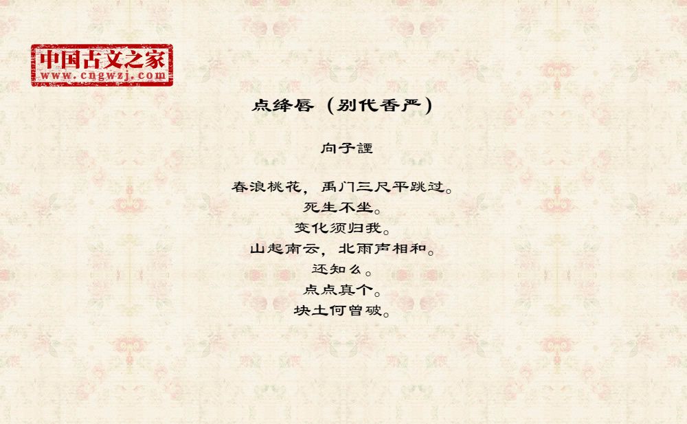 春浪桃花,禹门三尺平跳过。死生不坐。变化须归我。山起南云,北雨声相和。还知么。点点真个。块土何曾破。