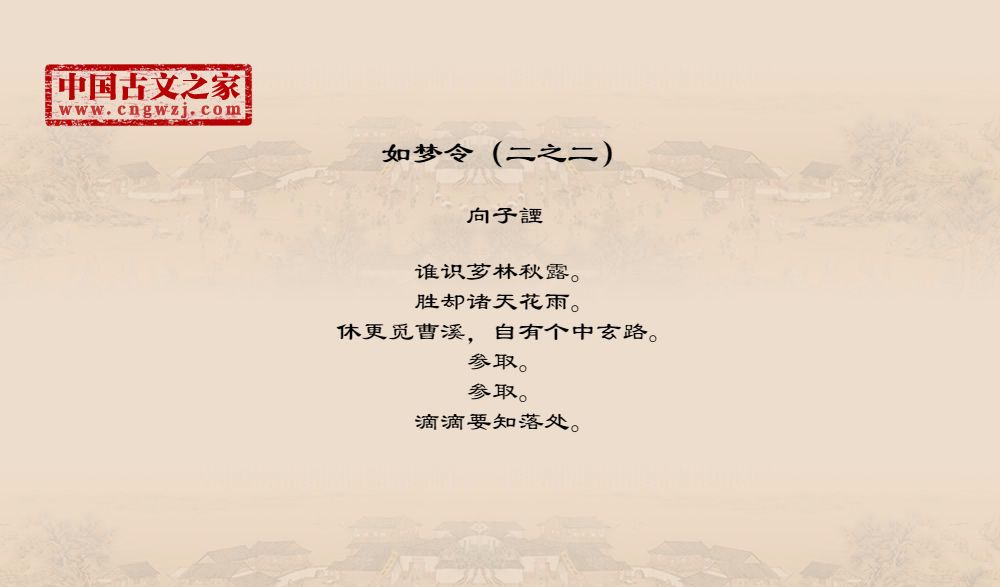 谁识芗林秋露。胜却诸天花雨。休更觅曹溪,自有个中玄路。参取。参取。滴滴要知落处。