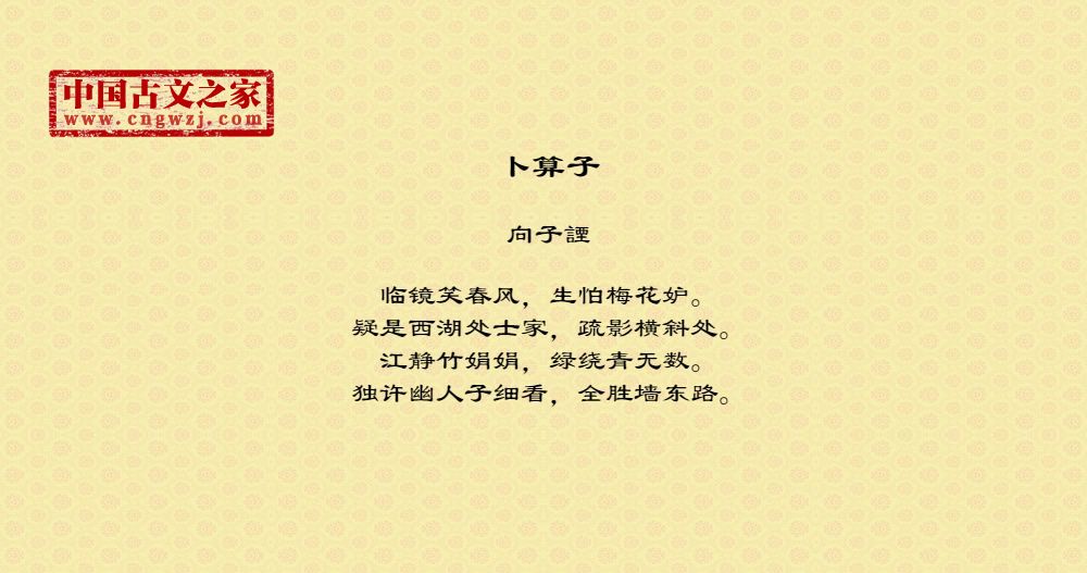 临镜笑春风,生怕梅花妒。疑是西湖处士家,疏影横斜处。江静竹娟娟,绿绕青无数。独许幽人子细看,全胜墙东路。
