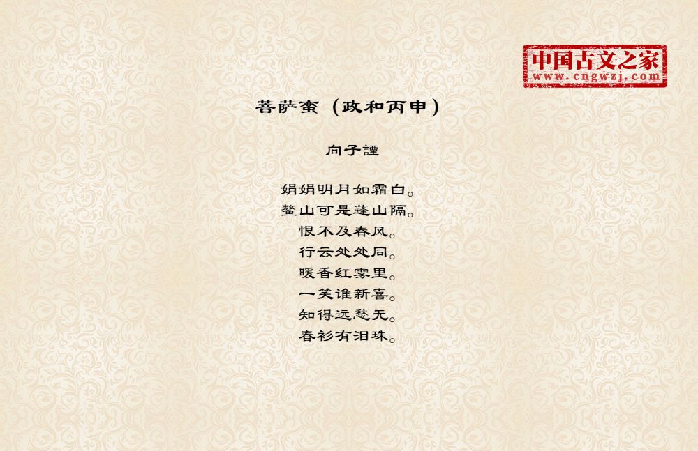 娟娟明月如霜白。鳌山可是蓬山隔。恨不及春风。行云处处同。暖香红雾里。一笑谁新喜。知得远愁无。春衫有泪珠。