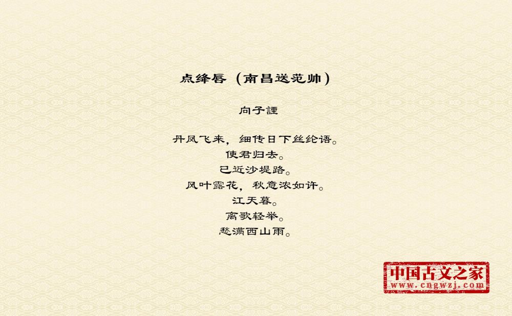 丹凤飞来,细传日下丝纶语。使君归去。已近沙堤路。风叶露花,秋意浓如许。江天暮。离歌轻举。愁满西山雨。