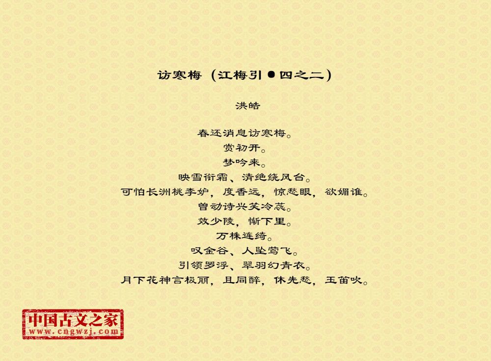 春还消息访寒梅。赏初开。梦吟来。映雪衔霜、清绝绕风台。可怕长洲桃李妒,度香远,惊愁眼,欲媚谁。曾动诗兴笑冷蕊。效少陵,惭下里。万株连绮。叹金谷、人坠莺飞。引领罗浮、翠羽幻青衣。月下花神言极丽,且同醉,休先愁,玉笛吹。