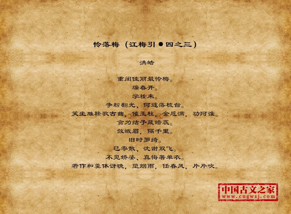 重闺佳丽最怜梅。牖春开。学妆来。争粉翻光、何遽落梳台。笑坐雕鞍歌古曲,催玉柱,金卮满,劝阿谁。贪为结子藏暗蕊。敛蛾眉,隔千里。旧时罗绮。已零散、沈谢双飞。不见娇姿、真悔著单衣。若作和羹休讶晚,堕烟雨,任春风,片片吹。