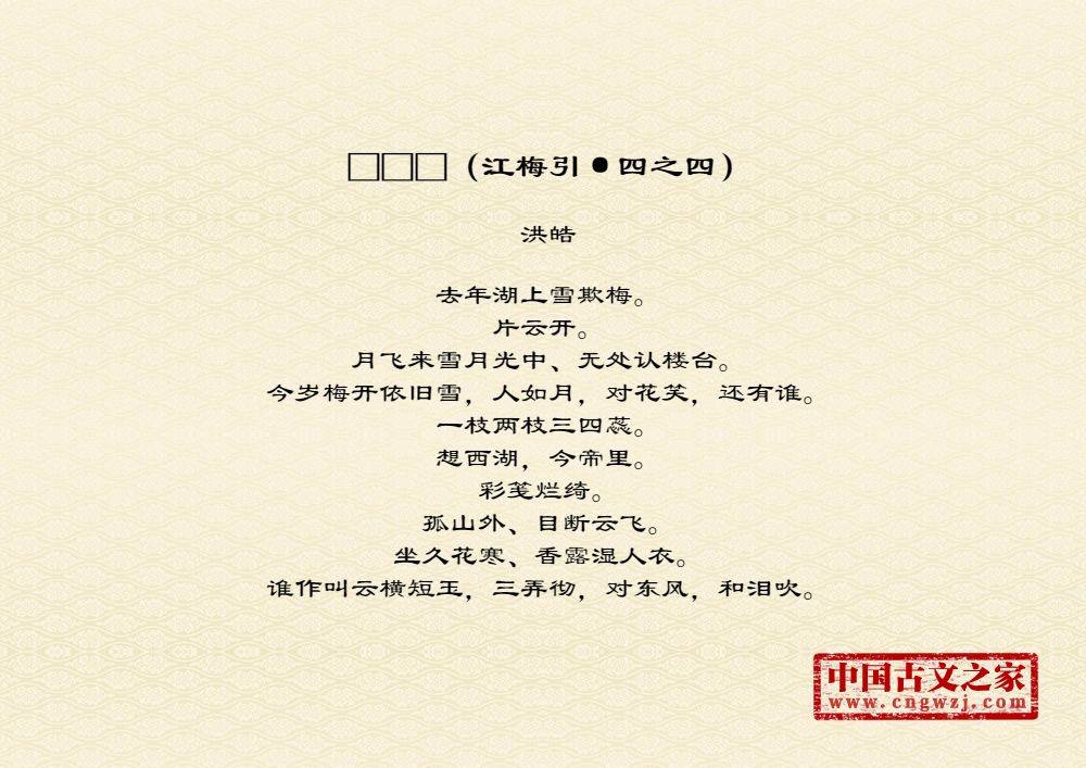 去年湖上雪欺梅。片云开。月飞来雪月光中、无处认楼台。今岁梅开依旧雪,人如月,对花笑,还有谁。一枝两枝三四蕊。想西湖,今帝里。彩笺烂绮。孤山外、目断云飞。坐久花寒、香露湿人衣。谁作叫云横短玉,三弄彻,对东风,和泪吹。