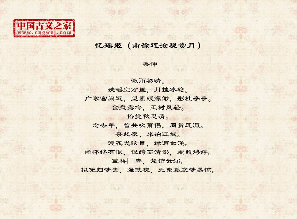 微雨初晴。洗瑶空万里,月挂冰轮。广寒宫阙近,望素娥缥缈,彤桂亭亭。金盘露冷,玉树风轻。倍觉秋思清。念去年,曾共吹箫侣,同赏蓬瀛。奈此夜、旅泊江城。谩花光眩目,绿酒如渑。幽怀终有恨,恨绮窗清影,虚照娉婷。蓝桥□杳,楚馆云深。拟凭归梦去,强就枕,无奈孤衾梦易惊。
