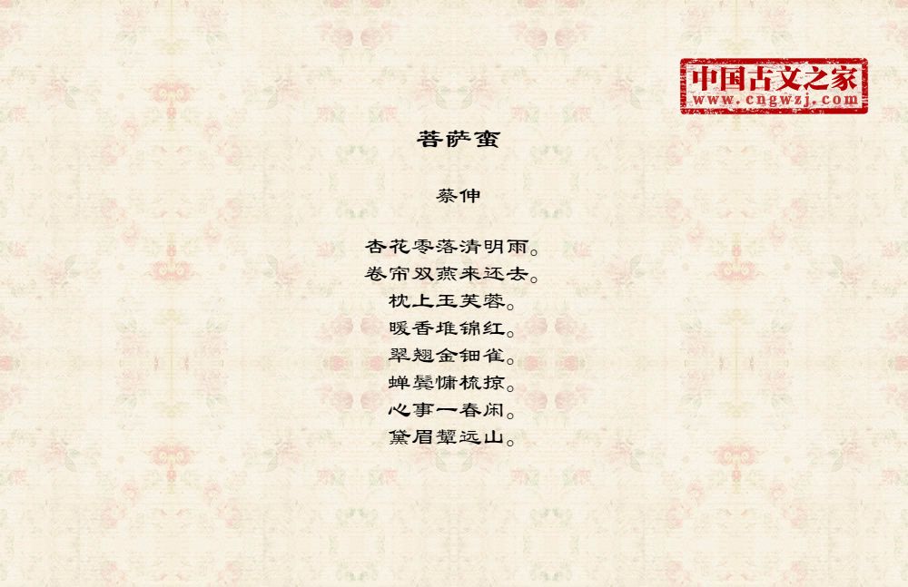 杏花零落清明雨。卷帘双燕来还去。枕上玉芙蓉。暖香堆锦红。翠翘金钿雀。蝉鬓慵梳掠。心事一春闲。黛眉颦远山。