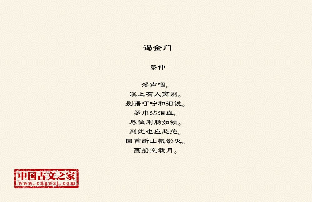溪声咽。溪上有人离别。别语叮咛和泪说。罗巾沾泪血。尽做刚肠如铁。到此也应愁绝。回首断山帆影灭。画船空载月。