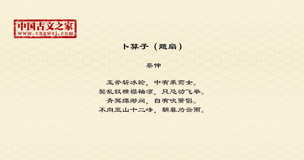 玉斧斩冰轮,中有乘鸾女。鬓乱钗横襟袖凉,只恐劝飞举。青冥缥缈间,自有吹箫侣。不向巫山十二峰,朝暮为云雨。