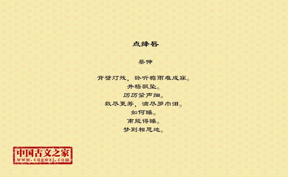 背壁灯残,卧听檐雨难成寐。井梧飘坠。历历蛩声细。数尽更筹,滴尽罗巾泪。如何睡。甫能得睡。梦到相思地。