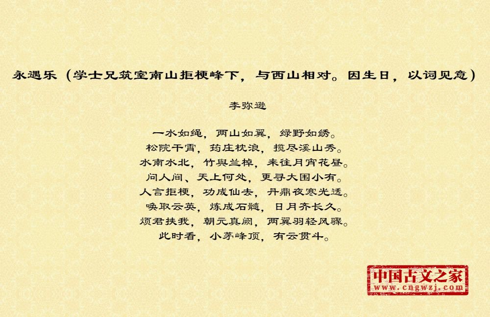 《永遇乐(学士兄筑室南山拒梗峰下,与西山相对。因生日,以词见意)》的原文打印版(李弥逊)