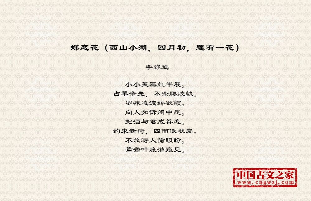 《蝶恋花(西山小湖,四月初,莲有一花)》的原文打印版(李弥逊)
