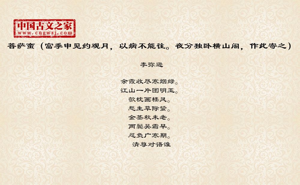 《菩萨蛮(富季申见约观月,以病不能往。夜分独卧横山阁,作此寄之)》的原文打印版(李弥逊)