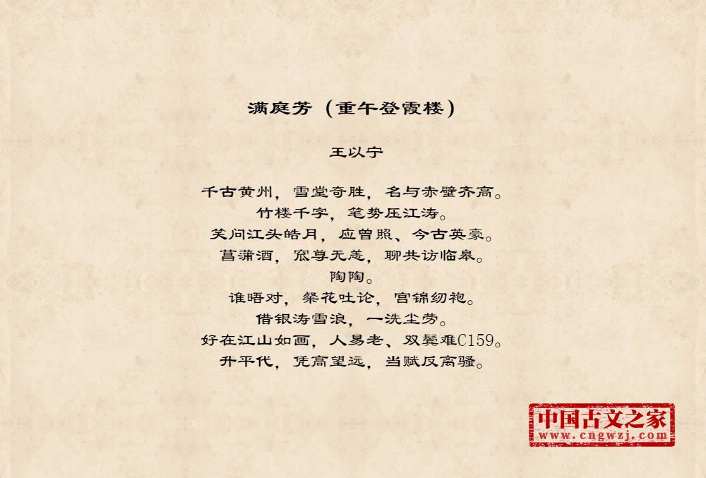 千古黄州,雪堂奇胜,名与赤壁齐高。竹楼千字,笔势压江涛。笑问江头皓月,应曾照、今古英豪。菖蒲酒,窊尊无恙,聊共访临皋。陶陶。谁晤对,粲花吐论,宫锦纫袍。借银涛雪浪,一洗尘劳。好在江山如画,人易老、双鬓难C159。升平代,凭高望远,当赋反离骚。
