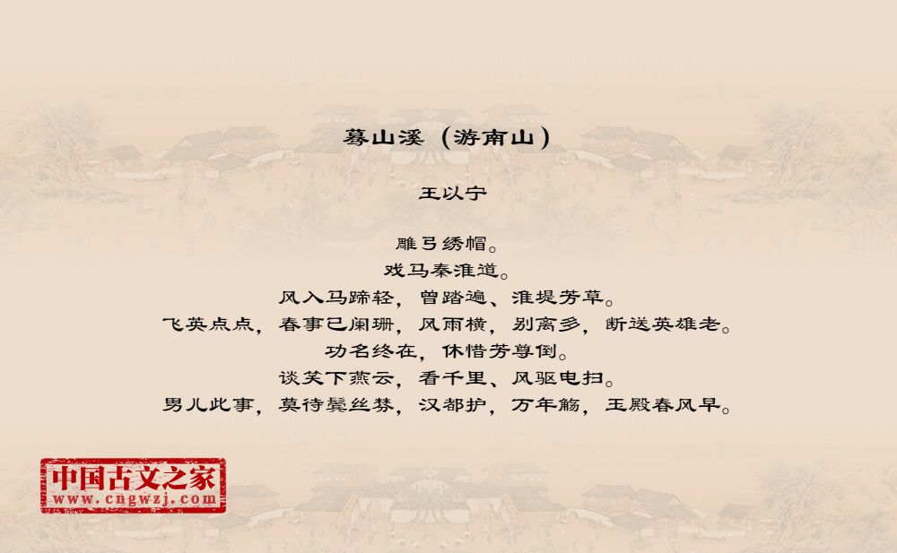 雕弓绣帽。戏马秦淮道。风入马蹄轻,曾踏遍、淮堤芳草。飞英点点,春事已阑珊,风雨横,别离多,断送英雄老。功名终在,休惜芳尊倒。谈笑下燕云,看千里、风驱电扫。男儿此事,莫待鬓丝棼,汉都护,万年觞,玉殿春风早。
