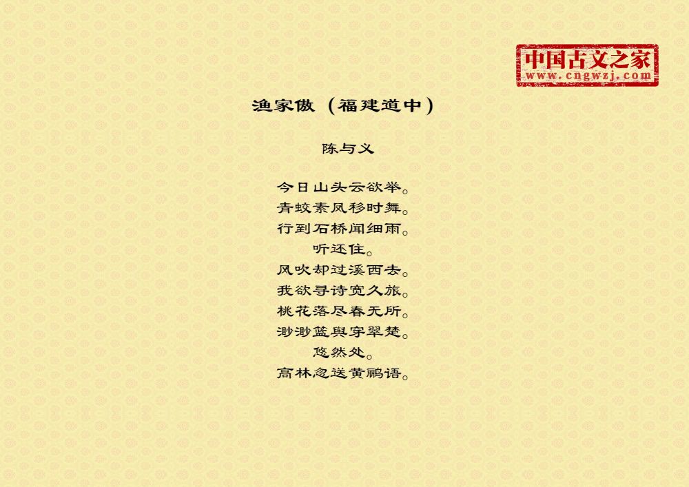 今日山头云欲举。青蛟素凤移时舞。行到石桥闻细雨。听还住。风吹却过溪西去。我欲寻诗宽久旅。桃花落尽春无所。渺渺篮舆穿翠楚。悠然处。高林忽送黄鹂语。