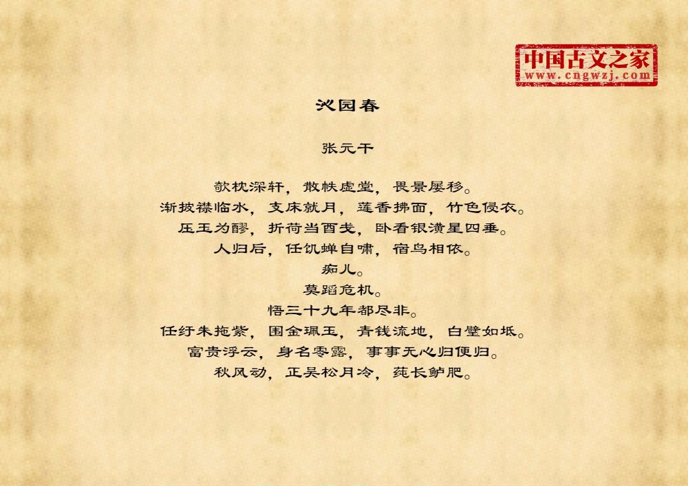 欹枕深轩,散帙虚堂,畏景屡移。渐披襟临水,支床就月,莲香拂面,竹色侵衣。压玉为醪,折荷当酉戋,卧看银潢星四垂。人归后,任饥蝉自啸,宿鸟相依。痴儿。莫蹈危机。悟三十九年都尽非。任纡朱拖紫,围金珮玉,青钱流地,白璧如坻。富贵浮云,身名零露,事事无心归便归。秋风动,正吴松月冷,莼长鲈肥。