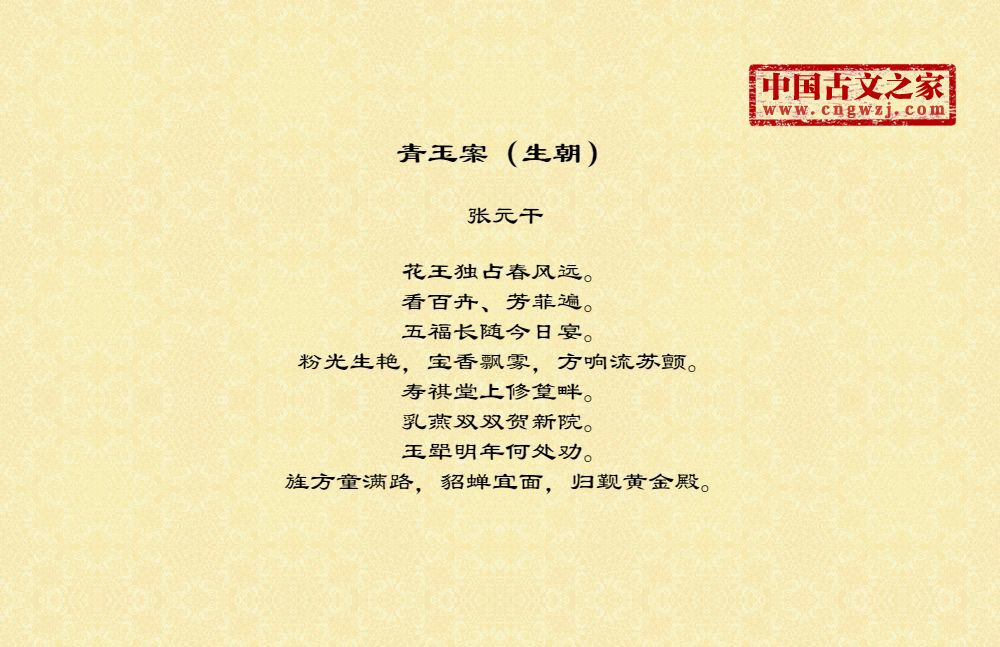 花王独占春风远。看百卉、芳菲遍。五福长随今日宴。粉光生艳,宝香飘雾,方响流苏颤。寿祺堂上修篁畔。乳燕双双贺新院。玉斝明年何处劝。旌方童满路,貂蝉宜面,归觐黄金殿。