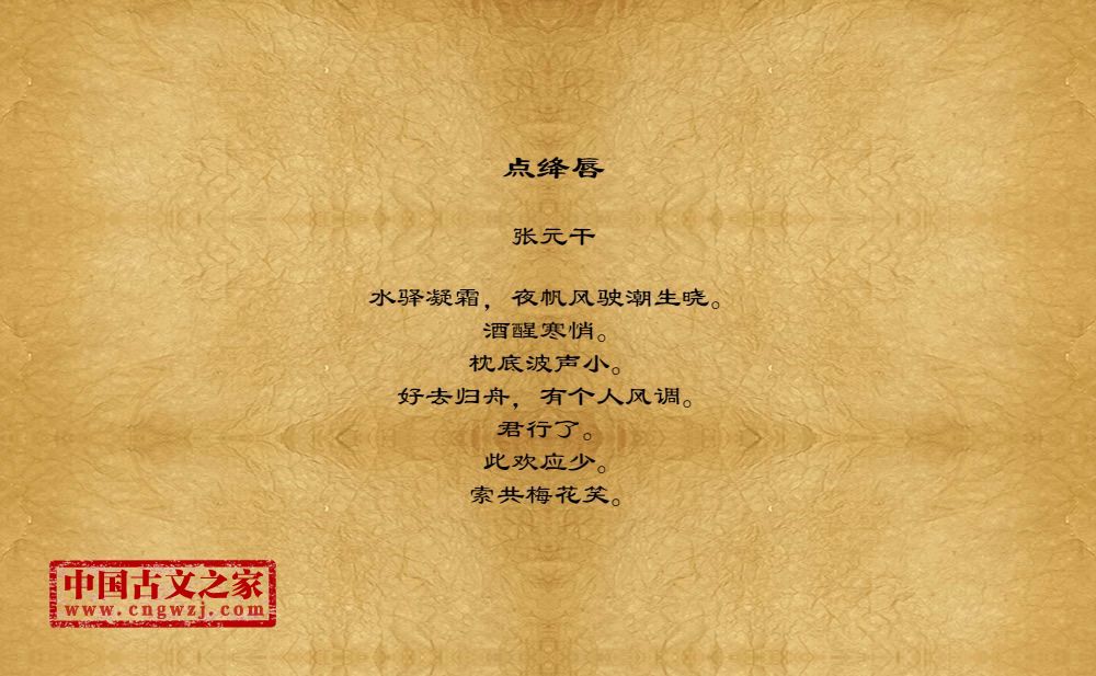 水驿凝霜,夜帆风驶潮生晓。酒醒寒悄。枕底波声小。好去归舟,有个人风调。君行了。此欢应少。索共梅花笑。