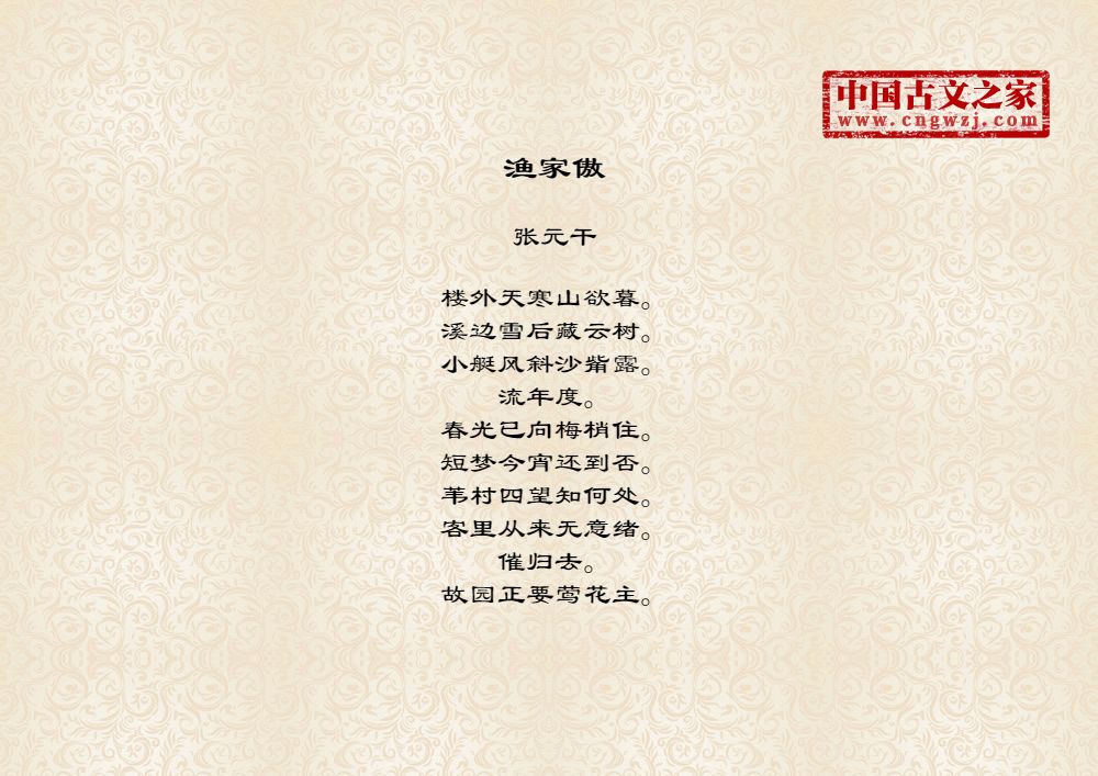 楼外天寒山欲暮。溪边雪后藏云树。小艇风斜沙觜露。流年度。春光已向梅梢住。短梦今宵还到否。苇村四望知何处。客里从来无意绪。催归去。故园正要莺花主。