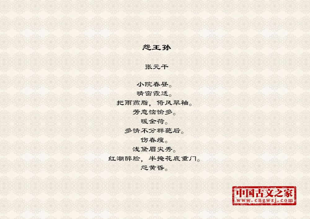 小院春昼。晴窗霞透。把雨燕脂,倚风翠袖。芳意恼愉多。暖金荷。多情不分群葩后。伤春瘦。浅黛眉尖秀。红潮醉脸,半掩花底重门。怨黄昏。