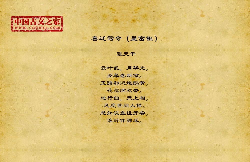 云叶乱,月华光。罗幕卷新凉。玉醅初泛嫩鹅黄。花露滴秋香。地行仙,天上相。风度世间人样。悬知洗盏径开尝。谁醉伴禅床。