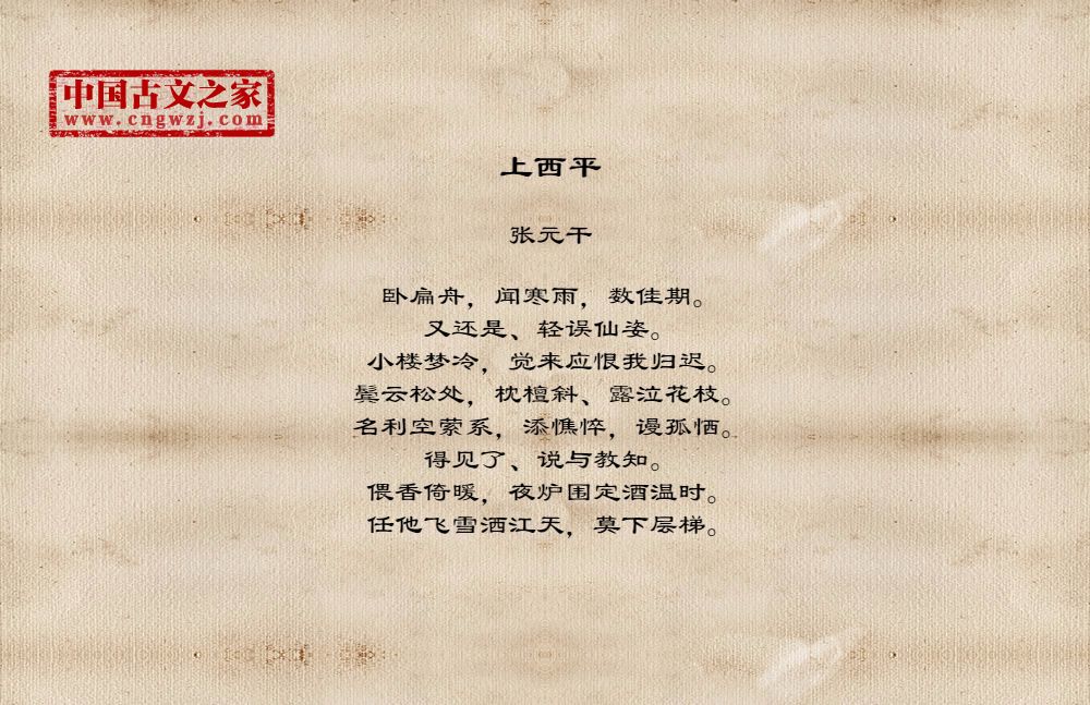 卧扁舟,闻寒雨,数佳期。又还是、轻误仙姿。小楼梦冷,觉来应恨我归迟。鬓云松处,枕檀斜、露泣花枝。名利空萦系,添憔悴,谩孤恓。得见了、说与教知。偎香倚暖,夜炉围定酒温时。任他飞雪洒江天,莫下层梯。