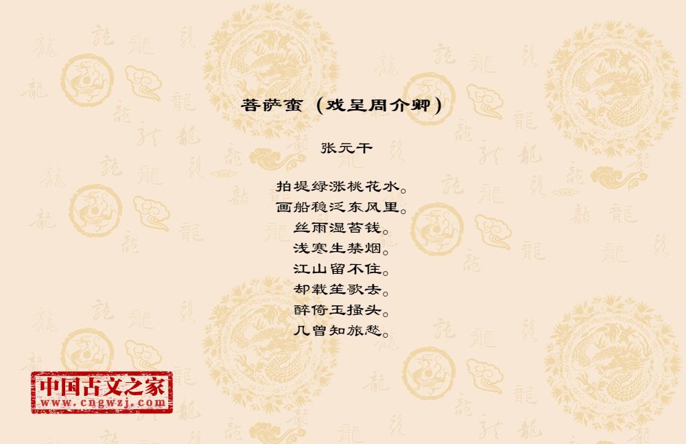 拍堤绿涨桃花水。画船稳泛东风里。丝雨湿苔钱。浅寒生禁烟。江山留不住。却载笙歌去。醉倚玉搔头。几曾知旅愁。