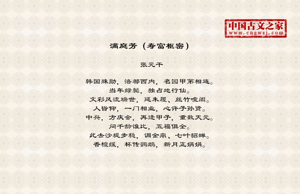 韩国殊勋,洛都西内,名园甲第相连。当年绿鬓,独占地行仙。文彩风流瑞世,延朱履、丝竹喧阗。人皆仰,一门相业,心许子孙贤。中兴,方庆会,再逢甲子,重数天元。问千龄谁比,五福俱全。此去沙堤步稳,调金鼎、七叶貂蝉。香檀缓,杯传鹦鹉,新月正娟娟。