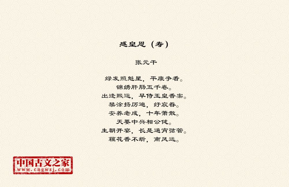 元干出身书香门第。其父名动,进士出身,官至龙图阁直学士,能诗。张元干受其家风影响,从小聪明好学,永泰的寒光阁、水月亭是他幼年生活和读书处。十四五岁随父
