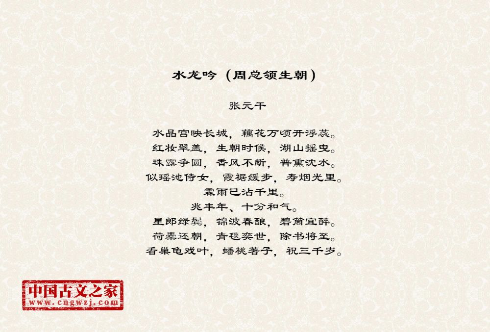 水晶宫映长城,藕花万顷开浮蕊。红妆翠盖,生朝时候,湖山摇曳。珠露争圆,香风不断,普熏沈水。似瑶池侍女,霞裾缓步,寿烟光里。霖雨已沾千里。兆丰年、十分和气。星郎绿鬓,锦波春酿,碧筒宜醉。荷橐还朝,青毯奕世,除书将至。看巢龟戏叶,蟠桃著子,祝三千岁。
