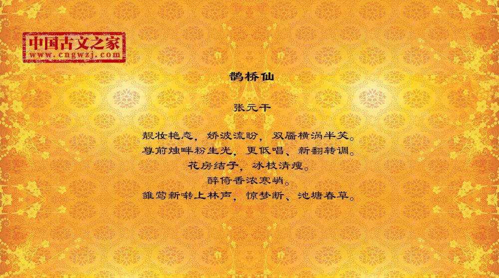 靓妆艳态,娇波流盼,双靥横涡半笑。尊前烛畔粉生光,更低唱、新翻转调。花房结子,冰枝清瘦。醉倚香浓寒峭。雏莺新啭上林声,惊梦断、池塘春草。