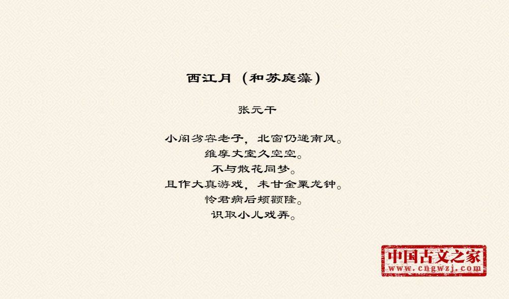 小阁劣容老子,北窗仍递南风。维摩丈室久空空。不与散花同梦。且作大真游戏,未甘金粟龙钟。怜君病后颊颧隆。识取小儿戏弄。