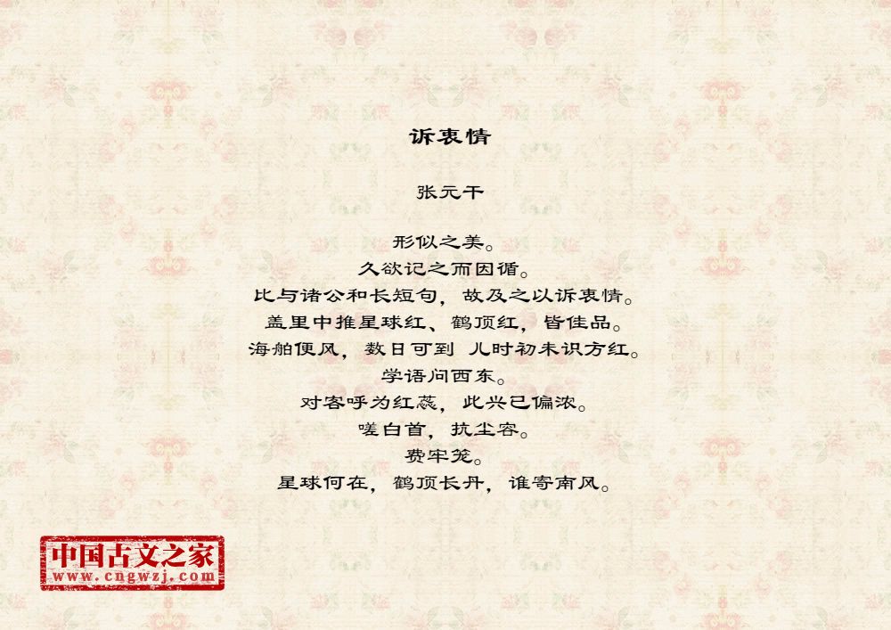 形似之美。久欲记之而因循。比与诸公和长短句,故及之以诉衷情。盖里中推星球红、鹤顶红,皆佳品。海舶便风,数日可到 儿时初未识方红。学语问西东。对客呼为红蕊,此兴已偏浓。嗟白首,抗尘容。费牢笼。星球何在,鹤顶长丹,谁寄南风。