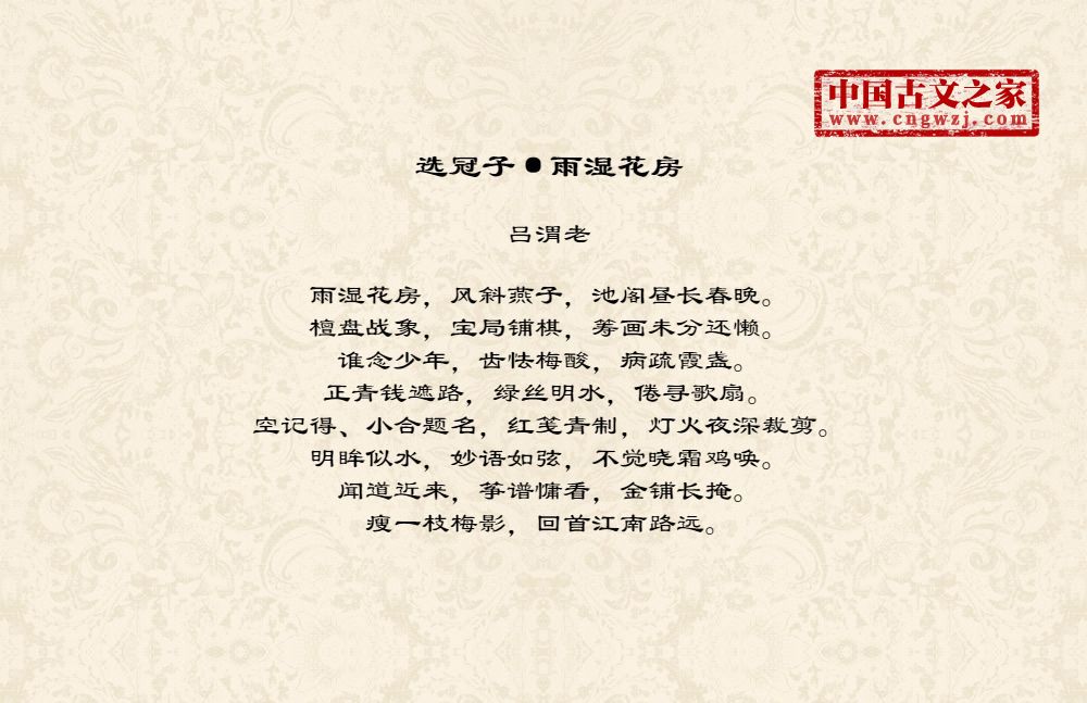 雨湿花房,风斜燕子,池阁昼长春晚。檀盘战象,宝局铺棋,筹画未分还懒。谁念少年,齿怯梅酸,病疏霞盏。正青钱遮路,绿丝明水,倦寻歌扇。空记得、小合题名,红笺青制,灯火夜深裁剪。明眸似水,妙语如弦,不觉晓霜鸡唤。闻道近来,筝谱慵看,金铺长掩。瘦一枝梅影,回首江南路远。