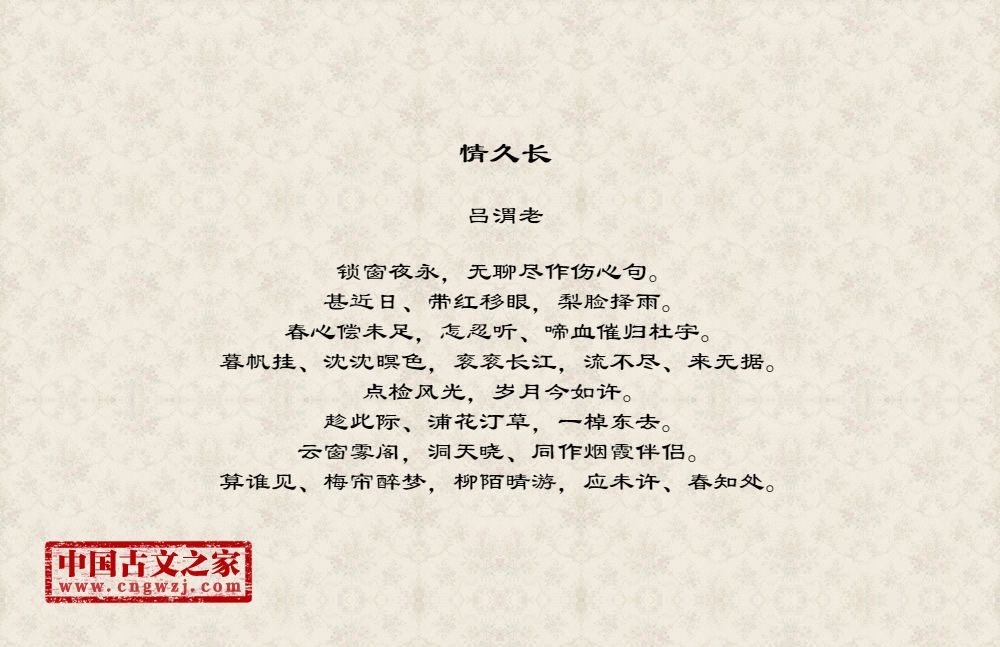 吕渭老(生卒年不详),一作吕滨老,字圣求,嘉兴(今属浙江)人。宣和、靖康年间在朝做过小官,有诗名。南渡后情况不详。赵师岌序其词云:“宣和末,有吕圣求者