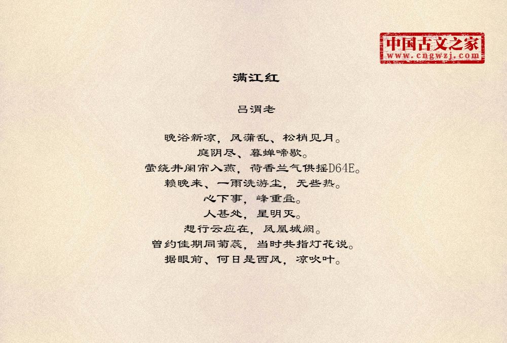 晚浴新凉,风蒲乱、松梢见月。庭阴尽、暮蝉啼歇。萤绕井阑帘入燕,荷香兰气供摇D64E。赖晚来、一雨洗游尘,无些热。心下事,峰重叠。人甚处,星明灭。想行云应在,凤凰城阙。曾约佳期同菊蕊,当时共指灯花说。据眼前、何日是西风,凉吹叶。