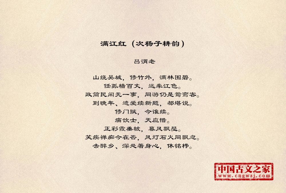 山绕吴城,修竹外,满林围碧。任孤樯百丈,远牵江色。政简民闲无一事,同游仍是鸳鸾客。到晚年、遗爱续新题,都堪说。修门赋,今谁续。痛饮士,天应惜。正彩霞垂帔,暮风飘瑟。笑疾禅痴今在否,风灯石火同飘忽。去醉乡、深处著身心,休铭栉。