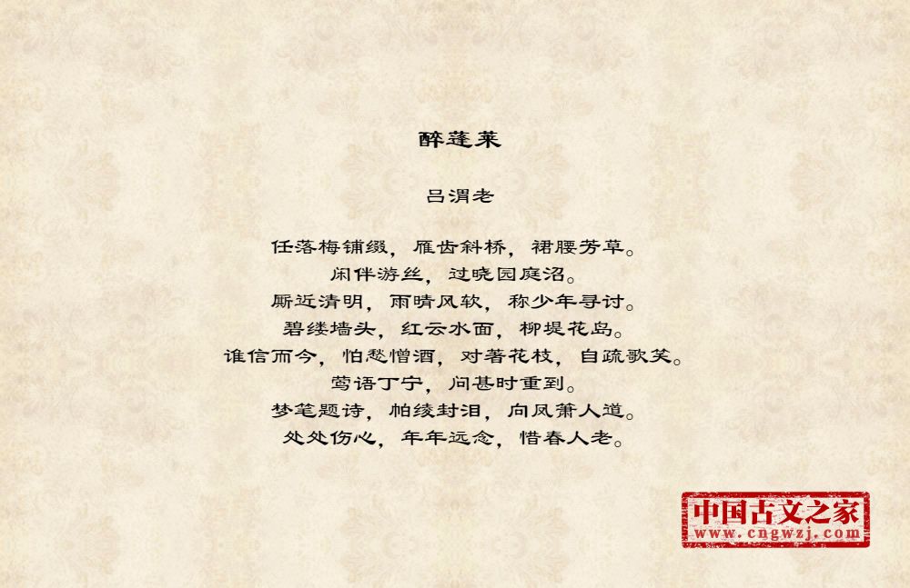 吕渭老(生卒年不详),一作吕滨老,字圣求,嘉兴(今属浙江)人。宣和、靖康年间在朝做过小官,有诗名。南渡后情况不详。赵师岌序其词云:“宣和末,有吕圣求者
