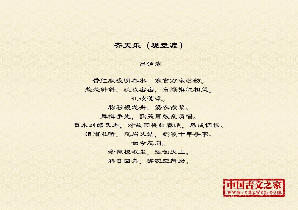 香红飘没明春水,寒食万家游舫。整整斜斜,疏疏密密,帘缬旗红相望。江波荡漾。称彩舰龙舟,绣衣霞桨。舞楫争先,歌笑箫鼓乱清唱。重来刘郎又老,对故园桃红春晚,尽成惆怅。泪雨难晴,愁眉又结,翻覆十年手掌。如今怎向。念舞板歌尘,远如天上。斜日回舟,醉魂空舞扬。