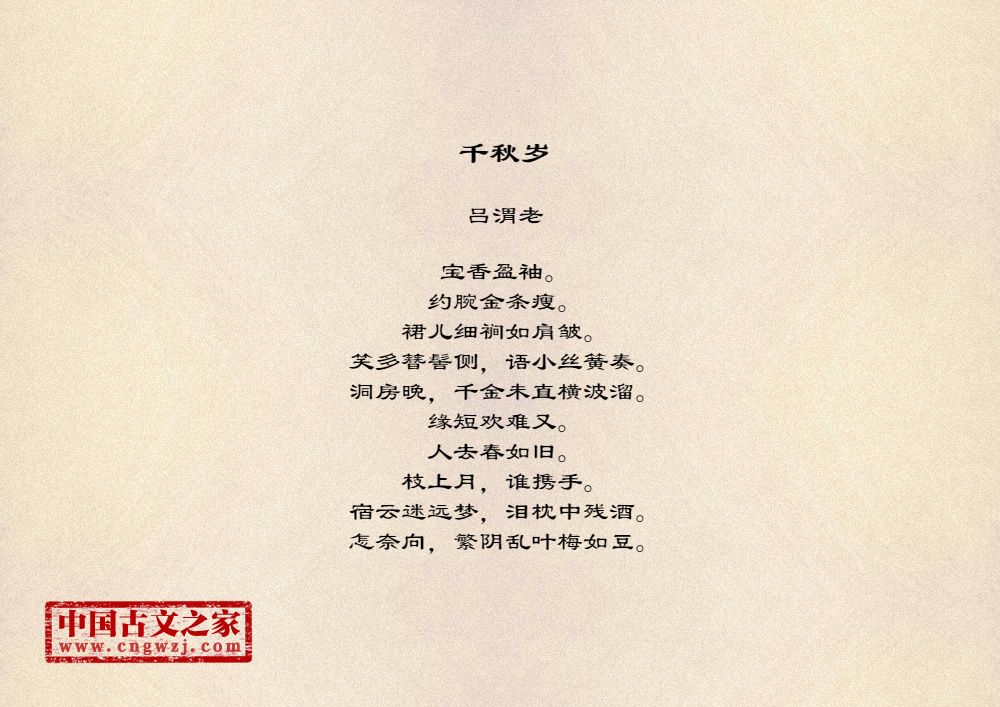 吕渭老(生卒年不详),一作吕滨老,字圣求,嘉兴(今属浙江)人。宣和、靖康年间在朝做过小官,有诗名。南渡后情况不详。赵师岌序其词云:“宣和末,有吕圣求者