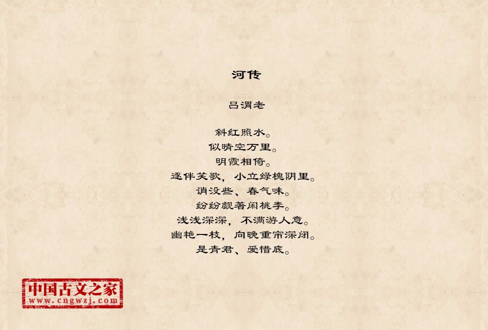 吕渭老(生卒年不详),一作吕滨老,字圣求,嘉兴(今属浙江)人。宣和、靖康年间在朝做过小官,有诗名。南渡后情况不详。赵师岌序其词云:“宣和末,有吕圣求者